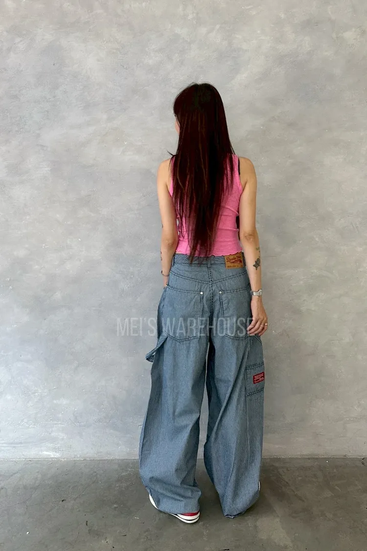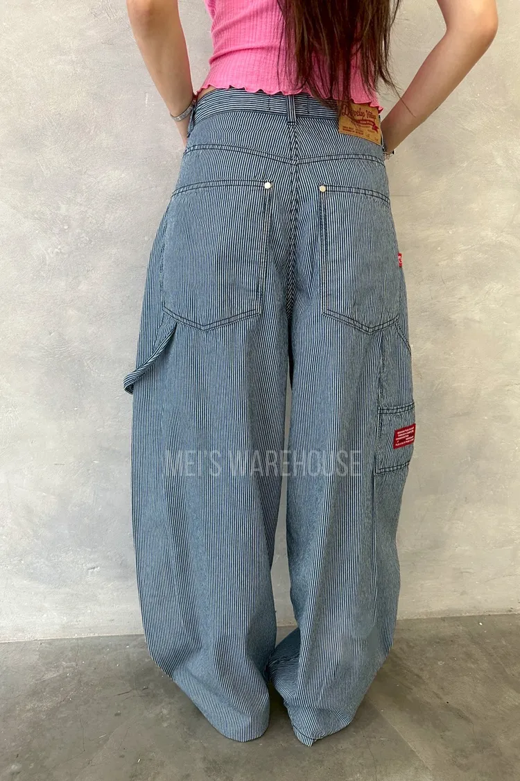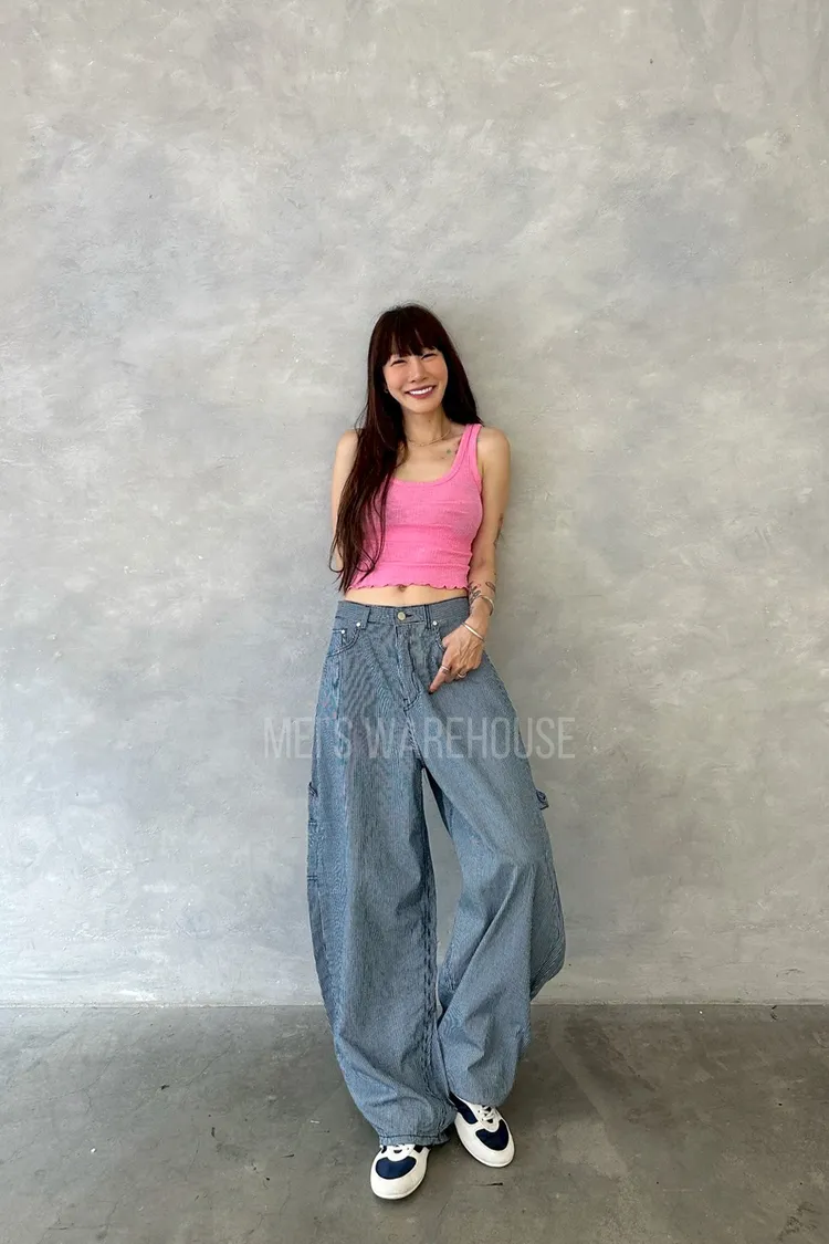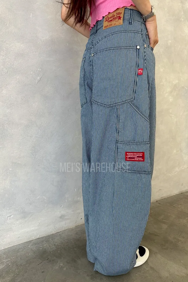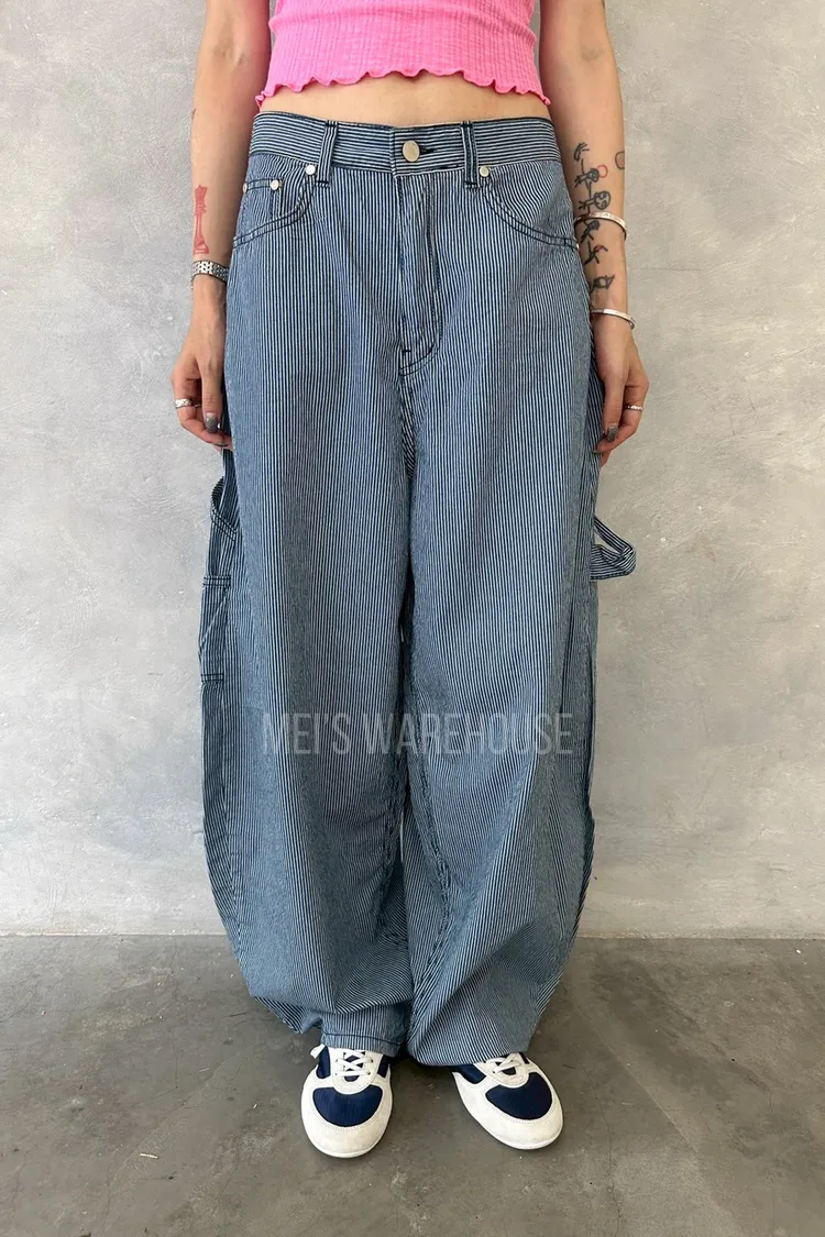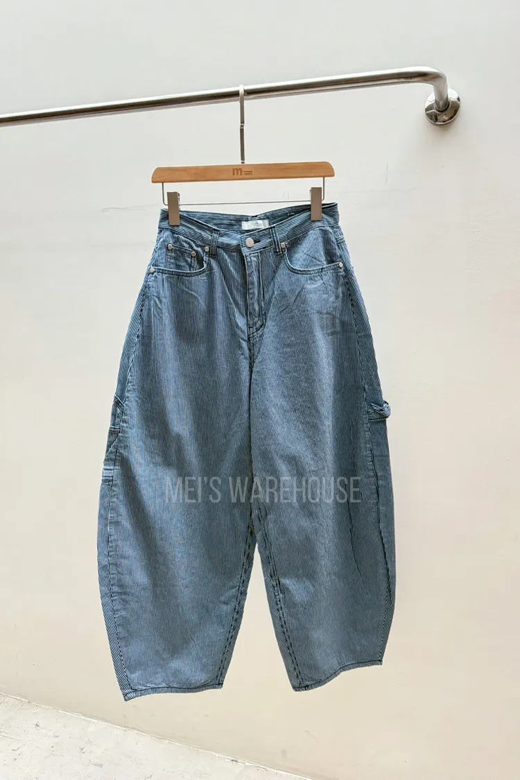 小紅標細條紋繭型褲